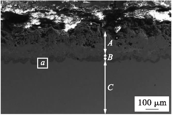 图8为高温氧化50 h后涂层与基体界面的SEM形貌,相应能谱分析结果(原子分数)如表4所示.由图8可见,经过50 h连续高温氧化后,涂层表面发生了较大变化,与高温氧化2 h时相比,涂层的总体厚度有所减薄,且Al全部扩散渗入NiAl层中.由表4可见,A区域中Ni和Al元素的原子比约为1∶1,接近NiAl金属间化合物的原子比,涂层厚度约为200 μm,而在高温氧化2 h时形成的Ni2Al3层大多转变为NiAl层,且Al作为亲氧元素在氧化过程中与O发生反应并形成了致密的α-Al2O3来保护基体,同时在涂层中存在较少的O元素.此外,在基体与涂层之间形成了厚约40 μm的B区域扩散层,且结合程度仍然很致密,扩散层中Ti和Al元素的原子比约为1∶3,接近TiAl3金属间化合物的原子比.在B、C区域基体中并未发现O元素.