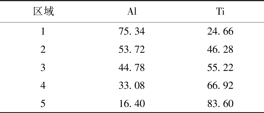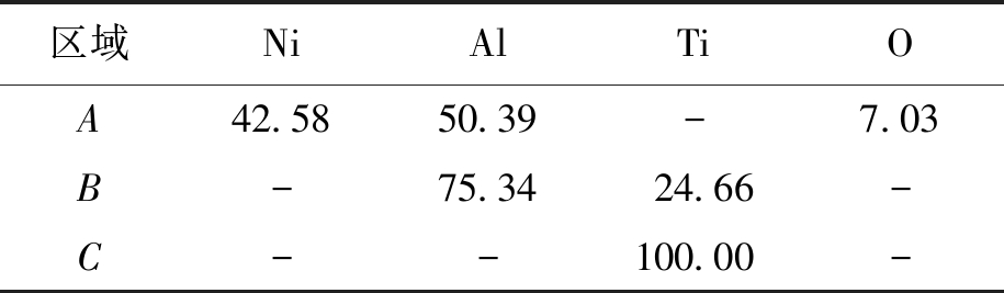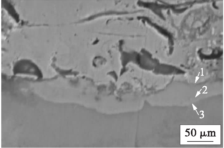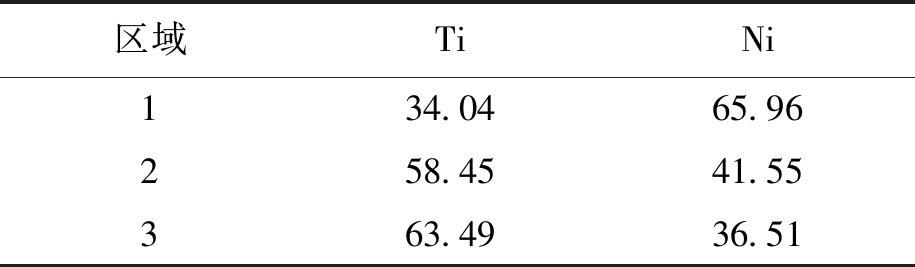 图7为图3中区域a的放大SEM形貌,其中1~3区域为原始NiAl涂层与基体的扩散层,相应的原子分数如表3所示.大体而言,扩散层中的元素均含有Ti和Ni,表明Ni与Ti之间发生了相互扩散和冶金反应,使得涂层由物理结合变为冶金结合,因而涂层的结合强度得到提高.