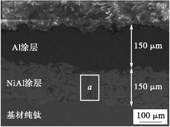 图1为喷涂态NiAl/Al复合涂层与基体界面的SEM形貌.由图1可见,NiAl涂层和Al涂层均为层状结构;Al涂层、NiAl涂层以及NiAl涂层与基体之间均为波浪式相接,界限明显,涂层致密,几乎未发现孔洞,此时涂层结合方式为物理结合.