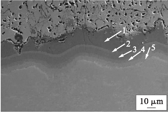 图9为图8中区域a的放大SEM形貌,相应能谱分析结果(原子分数)如表5所示.与高温氧化2 h后的试件进行对比后发现,经过50 h连续高温氧化后,原始Al层已经充分扩散渗入基体内,扩散层数量增加且厚度变宽.从扩散层1区域到5区域,Al含量下降,Ti含量上升,表明在氧化过程中Al元素不仅向基体中渗入,而且可与空气中的O反应生成了致密的α-Al2O3.在高温环境中由于基体和涂层存在浓度差,Ti和Al元素发生了相互扩散,因而基体和涂层之间结合稳定.