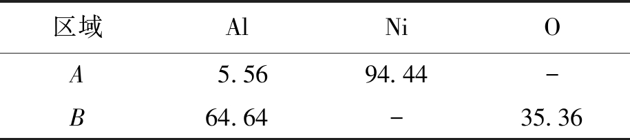 图2为图1中区域a的放大SEM形貌,相应的能谱分析结果(原子分数)如表1所示.由表1可见,A区域几乎均为Ni元素,B区域为Al2O3.喷涂时NiAl丝中的Al被氧化为Al2O3,且可在NiAl涂层中形成条状或球状的阻挡层来阻止基体的高温氧化.由于喷涂时间较短且受温度影响,涂层中几乎未形成NiAl相.