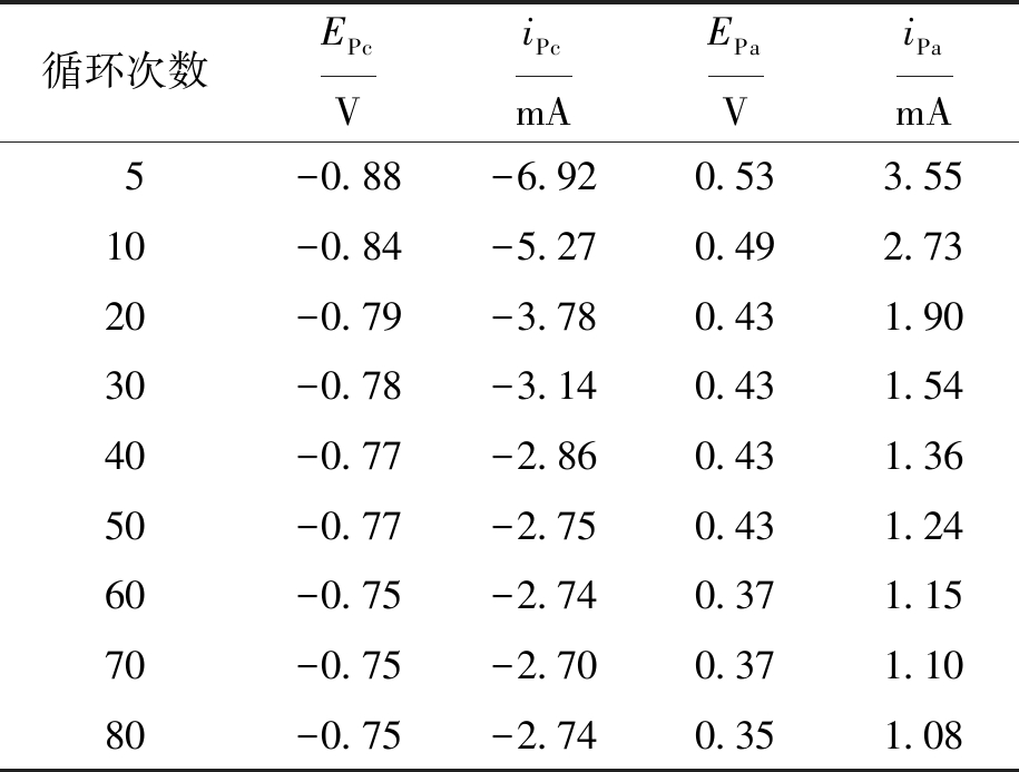 表3 循环次数对峰值电位与峰值电流的影响