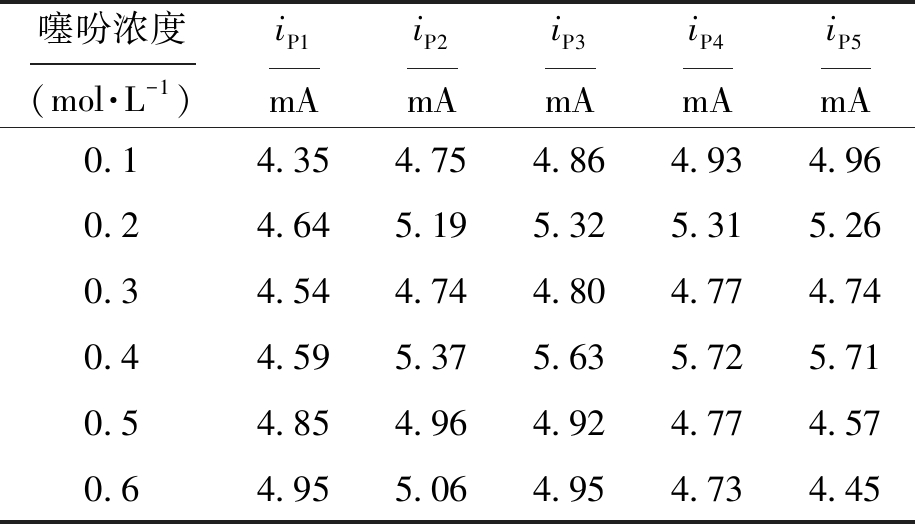 表1 噻吩浓度对峰值电流的影响