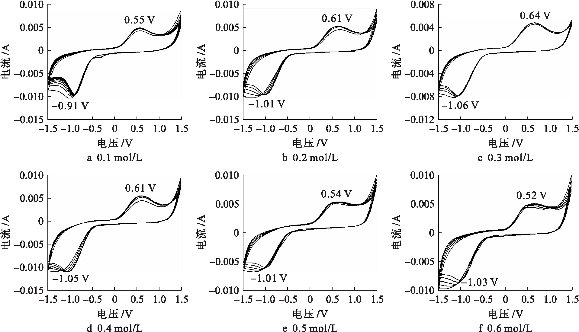 当扫描速率为0.1 V/s,循环扫描5次后不同噻吩单体浓度下的循环伏安曲线如图1所示.