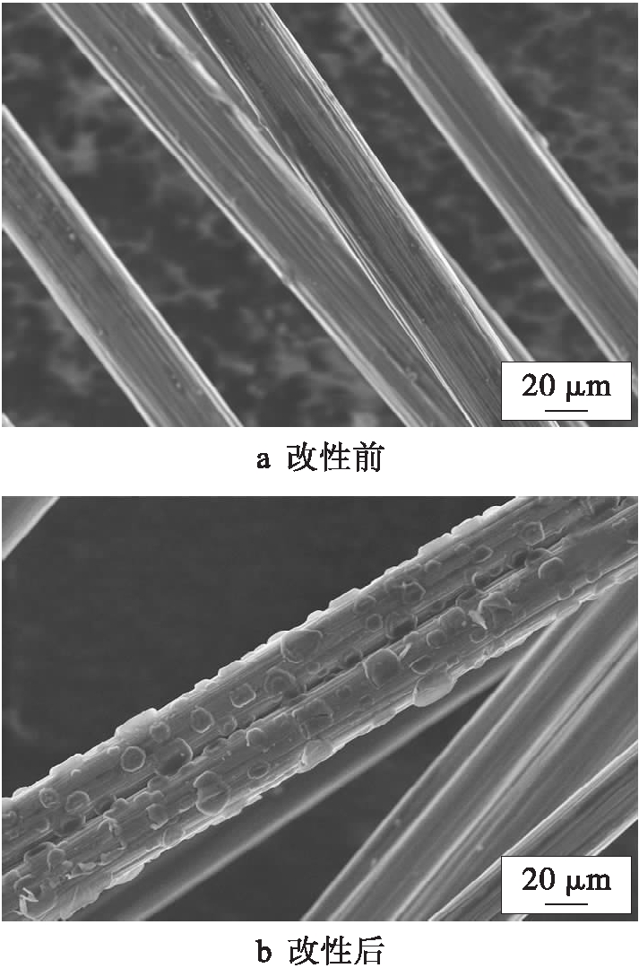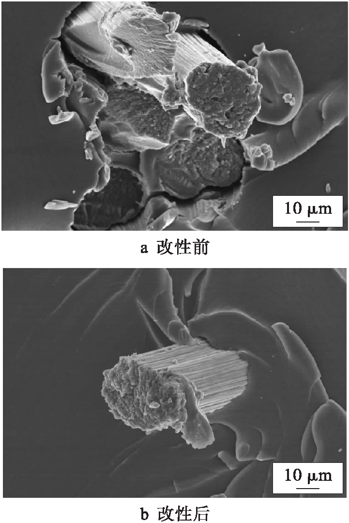 图6为碳纤维/环氧树脂复合材料的拉伸断口形貌.由图6可见,未经改性的碳纤维与树脂基体在断裂处具有较大的间隙和凹槽,环氧树脂与碳纤维界面粘结力较差.经过电化学聚合改性后,碳纤维表面活性官能团数量增加且与环氧树脂发生了化学反应,化学键合作用增强,因此,碳纤维/环氧树脂复合材料结合良好且断面无明显凹槽,进一步表明电化学聚合改性后噻吩碳纤复合材料的界面性能得到显著提高.