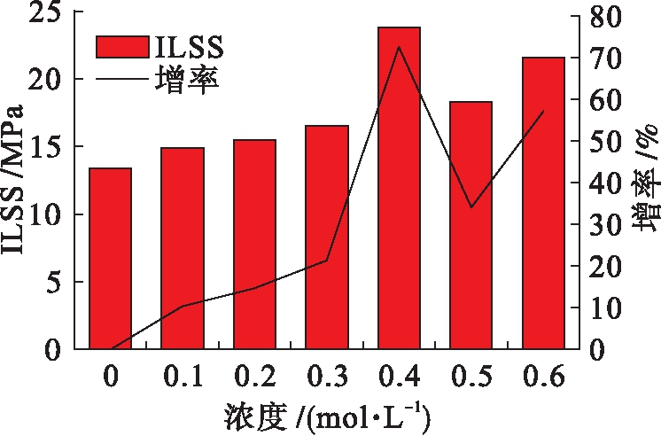 图4为碳纤维/环氧树脂复合材料的层间剪切强度(ILSS).由图4可见,与未经过电化学聚合改性的碳纤维/环氧树脂复合材料相比,当噻吩单体浓度为0.1 mol/L时,碳纤维/环氧树脂复合材料的层间剪切强度可由13.46 MPa增加到14.95 MPa,提高了约11.07%.随着噻吩单体浓度的增加,复合材料的层间剪切强度呈现总体上升趋势.当噻吩单体浓度为0.4 mol/L时,层间剪切强度可由改性前的13.46 MPa增加到23.79 MPa,层间剪切强度增长幅度达到最大,层间剪切强度提高了约76.75%,复合材料的界面性能明显增强.这是因为碳纤维表面生成的聚噻吩增加了碳纤维的表面极性,使得碳纤维与环氧树脂之间存在的化学键合作用增强,因而复合材料的界面性能显著改善,进而提高了碳纤维/环氧树脂复合材料的层间剪切强度[13].当噻吩单体浓度继续增大时,形成在碳纤维表面上的聚合物层可能出现不均匀、不稳定现象,因而碳纤维与环氧树脂的界面粘结强度降低,进而导致碳纤维增强复合材料的层间剪切强度有所下降.