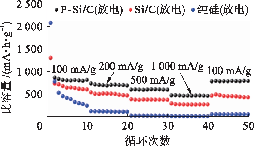 图7为纯硅电极、P-Si/C和Si/C电极的倍率性能对比.将电极分别在100、200、500和1 000 mA/g电流密度下进行充放电循环,每10次循环为一个周期,10次循环之后改变电流密度再次进行充放电循环.由图7可见,当电流密度依次为100、200、500 mA/g时,P-Si/C电极的平均比容量分别为840、730和620 mA·h/g,相比其他两种电极,该电极具有更高的比容量.此外,即使在1 000 mA/g的电流密度条件下进行循环,P-Si/C电极的比容量仍能达到较大数值,该比容量可在循环过程中保持平稳且未发生明显衰减.当电流密度恢复到初始状态时,P-Si/C电极的比容量又恢复上升.总体而言,P-Si/C电极在循环过程中比容量基本保持平稳,且未发生明显衰减,表明P-Si/C电极具有很好的倍率性能.