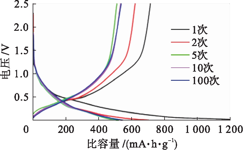 图5为当电流密度为500 mA/g时,P-Si/C电极的充放电曲线.由图5可见,当电流密度为500 mA/g时,P-Si/C电极的第1、2、5、10、100次循环后的充放电电压平台稳定在0~0.2 V.P-Si/C电极的首次充电和放电比容量分别为688和1 200 mA·h/g,库伦效率为58%,且此时库伦效率较低.自第2次循环开始,P-Si/C电极的充电和放电比容量比较接近,且分别为716和612 mA·h/g,此时库伦效率达到了85%.第5次循环时P-Si/C电极的充电比容量和放电比容量分别为530和490 mA·h/g,而库伦效率升高为92.5%.第10次循环时P-Si/C电极的充电比容量为520 mA·h/g,放电比容量为501 mA·h/g,库伦效率高达96.3%.此后P-Si/C电极的可逆比容量衰减较慢,且几乎稳定于500 mA·h/g.与图4对比可知,添加P123后P-Si/C电极的充放电曲线更加稳定.这是因为硅颗粒均被嵌入碳基底中,相当于在硅球外面加设一层外骨骼,限制了硅球收缩和膨胀的最大限度,使得由硅的体积效应带来的影响大为减小.同时电极材料的粉末化程度降低,且SEI膜更加稳定而不易发生破裂和再生成现象,进而使得电解质消耗减少,因而P-Si/C电极的循环寿命和可逆容量得以提高.