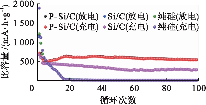图6为纯硅电极、P-Si/C和Si/C电极在500 mA/g电流密度下的循环性能对比结果.由图6可见,虽然纯硅电极首次充电比容量高达1 800 mA·h/g,但是在前18次循环过程中,随着循环次数的增加,其比容量大幅度衰减.P-Si/C电极的放电比容量在循环初期得到提升,经100次循环后该比容量为521 mA·h/g,与第2次循环放电比容量数值相比,具有85.4%的保留率.在20次循环内P-Si/C电极的库伦效率从首次循环的58%升高到了98%以上.