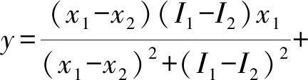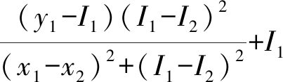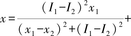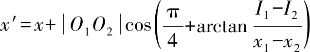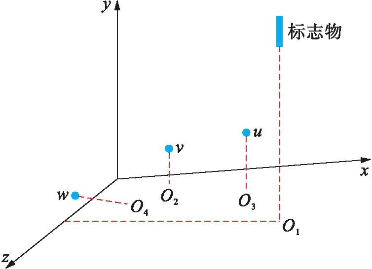图2为测量装置进行测量的三维图示.图2中,点u、v、w分别表示某一时刻各传感器的位置坐标点,u、v的移动范围线段为O2O3,w的移动范围线段为O2O4,O1表示标志物的中心点对应的地面投影点,即测量点,I1、I2和I3为各传感器测量结果,得到u的坐标为(x1,I1),v的坐标为(x2,I2),w的坐标为(y1,I3),综合三个点的坐标及线段O2O3与O2O4之间的垂直关系,得到O2O3与O2O4所在直线的方程式,即