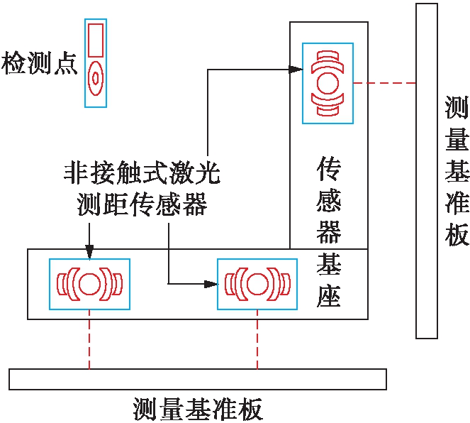 大地测量能够描述物体空间信息,是一种确定测量点精确坐标位置的测量方法,其装置结构如图1所示.整个测量装置包含三个非接触式激光测距传感器、两个传感器基座以及两个测量基准板.将传感器安装到对应的基座上,在横向上安装两个传感器,在纵向上安装一个传感器,将横向记作x方向,将纵向记作y方向;将测量基准板分别放置在x方向与y方向的两侧,在检测点设置标志物,并平稳移动各激光传感器位置,通过将传感器获取的数据进行组合计算,得到测量点在x方向和y方向的相对位移及其中心点绕垂直轴旋转角度.