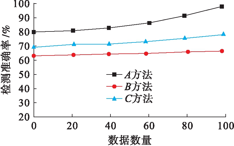采用所提检测方法与基于纳米精度的测量误差检测方法以及基于有限元模态分析的误差检测方法进行实验,三种方法分别用A、B、C表示,分别对比三种误差检测方法的检测准确率、检测成本开销及检测时间.