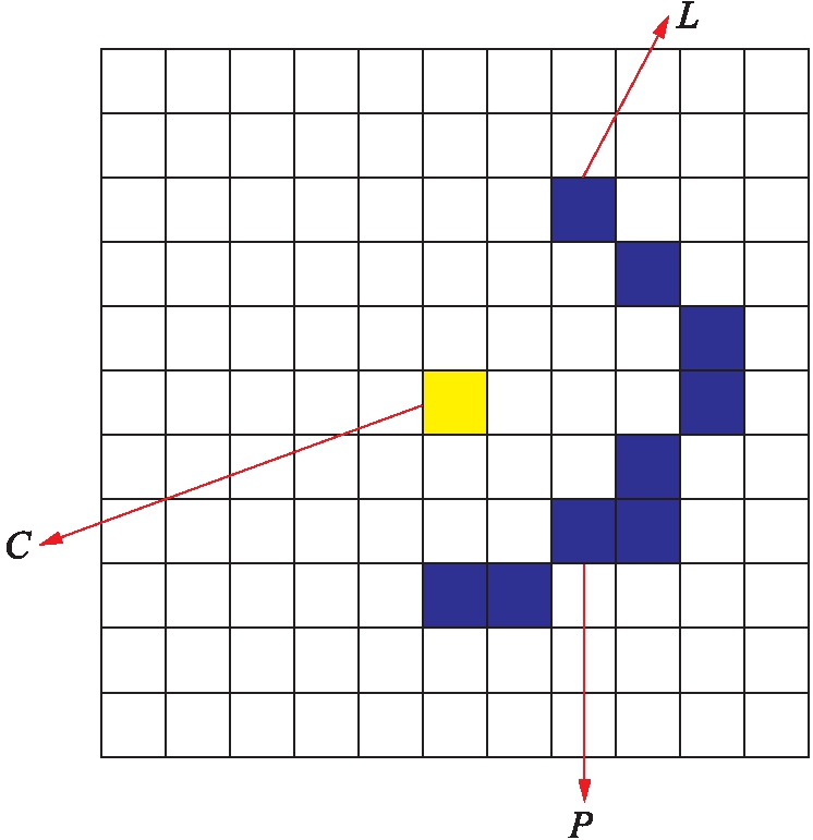 为了实现对植物景观三维图像的区域边缘锐化,首先需要构建植物景观三维图像的稀疏表示模型,采用分区域特征匹配方法进行植物景观三维图像的分块检测和区域性融合处理.根据图像低分辨率的特点,提取植物景观三维图像的分块区域匹配特征量,得到稀疏表示的最优化系数[5-6];采用自适应融合方法进行植物景观特征检测的分块规划设计;采用锐化模板增强技术进行植物景观三维图像的边缘锐化处理,提高对植物景观三维图像的边缘锐化能力.植物景观三维图像的稀疏表示模型如图1所示,L表示模板子块,C表示用于匹配的候选目标区域,P表示植物景观三维图像表面点特征空间尺度因子.