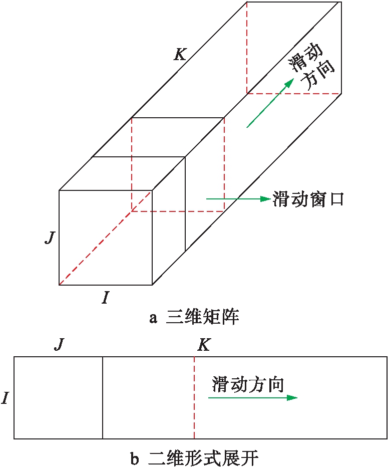 在故障数据属性识别过程中,由于故障数据之间具有相似性,故采用滑动窗口技术来区分.在滑动窗口中滑过的数据集合可以通过一个三维数据矩阵X(I×J×K)描述,I为变量数,J为采样点数量,K为批量数量,本文将该矩阵展开为二维矩阵形式X′(I×K),数据矩阵分块示意图如图2所示.