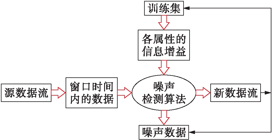 本文通过离群熵检测故障数据噪声,并对其进行提取.在特定的数据集合S中,假设噪声数据集为O,则正常数据集为S′=S-O.计算离群熵,取正常噪声数据集O和数据集S′,其中各个数据需要获取数据每一维属性的信息增益,而通过对样本进行训练即可准确地得到各个属性的增益.在开始进行噪声检测时,先对一个包含正常数据和噪声数据的训练集进行分析,从而获得各个属性的信息增益.本文设计的数据噪声检测提取过程如图1所示.