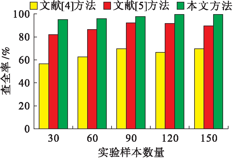分析图5可知,本文方法平均查全率可达到95%,而文献[4]方法查全率均在80%以下,文献[5]的方法查全率可达到90%,但不稳定.本文方法将采集到的数据噪声信号划分成有色噪声和白噪声,并利用小波分析法进行了剔除,在提高识别精度的基础上,对于无噪声干扰的数据进行识别,能够增加故障数据属性识别查全率.