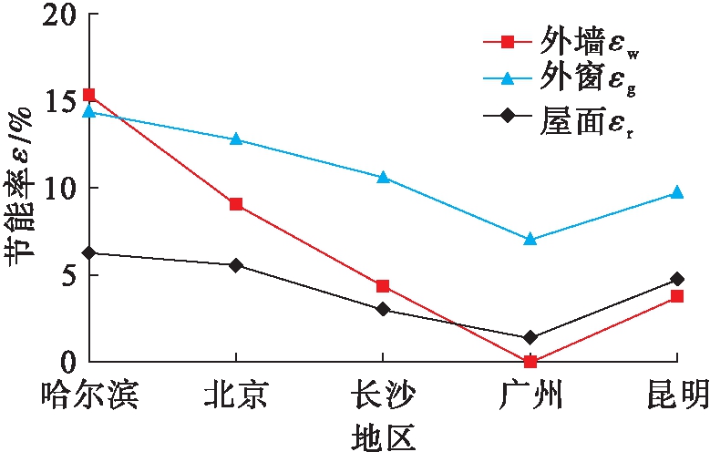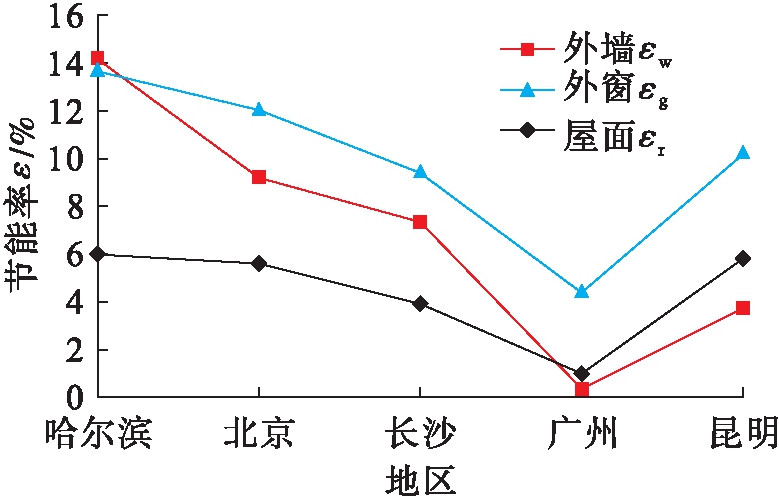 由图7可知,酒店建筑在哈尔滨地区,各围护结构节能率ε分别为外墙19.4%、外窗18.5%、屋面9.8%,节能潜力表现为外墙>外窗>屋面.在北京和长沙地区,外墙εw分别为14.5%和10.0%,外窗εg分别为17.3%和15.5%,屋面εr分别为8.2%和5.5%,节能潜力表现为外窗>外墙>屋面.在广州地区,外墙εw、外窗εg和屋面εr分别为2.7%、12.2%和3.9%,节能潜力表现为外窗>屋面>外墙.在昆明地区,外墙εw、外窗εg和屋面εr分别为4.1%、13.8%和3.1%,节能潜力表现为外窗>外墙>屋面.