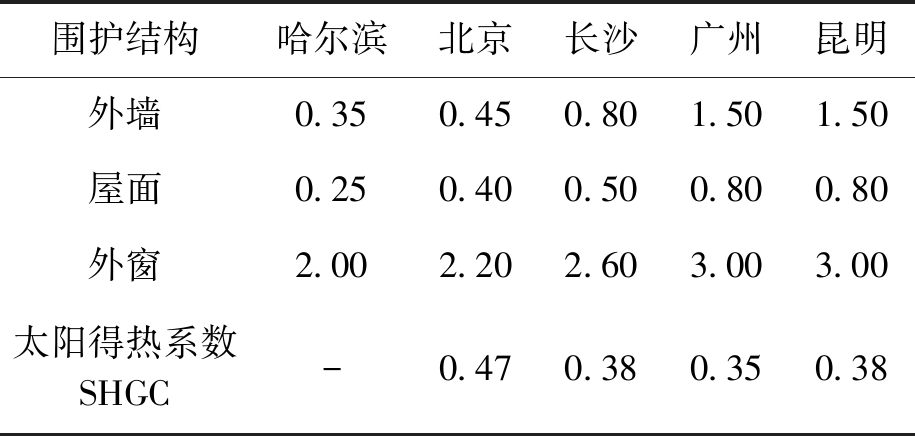 围护结构哈尔滨北京长沙广州昆明外墙0.350.450.801.501.50屋面0.250.400.500.800.80外窗2.002.202.603.003.00太阳得热系数SHGC-0.470.380.350.38