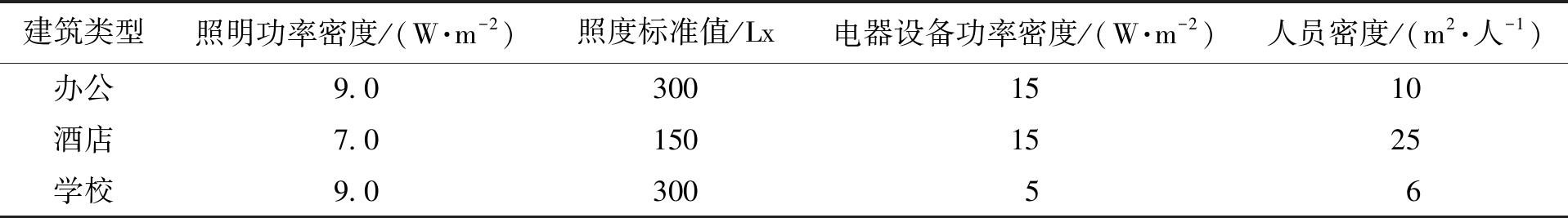 建筑照明、电器设备、人员密度等均按照《公共建筑节能设计标准》(GB50189-2015)[10]和《建筑照明设计标准》(GB50034-2013)[11]规定设置,参数设定如表1所示.