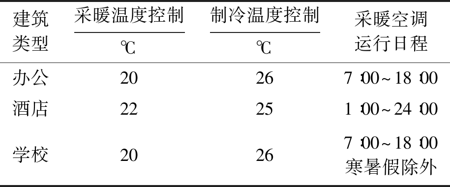 建筑类型采暖温度控制℃制冷温度控制℃采暖空调运行日程办公20267∶00~18∶00酒店22251∶00~24∶00学校20267∶00~18∶00寒暑假除外