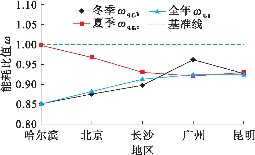 夏季在各城市ωq,g,c均小于1,越往广州地区ωq,g,c越小,节能效果越好,在广州地区,夏季节能效果好于冬季.根据文献[10]分析可知,越往广州地区,SHGC越小.当提高外窗性能时,外窗的K值和SHGC系数减小,能有效减少夏季太阳辐射得热而降低空调负荷.广州地区冬季采暖能耗占比很小,夏季由K值减小带来的节能效果不如因SHGC的减小而减少太阳辐射得热所降低的冷负荷的节能效果好.综合全年来看,无论冬季和夏季,提高外窗性能,其节能效果都较好.