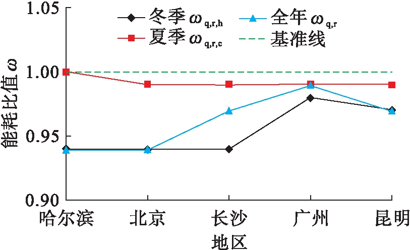 夏季外墙保温在各城市ωq,w,c均大于1,且越往哈尔滨地区ωq,w,c越大,表示在以上城市的夏季,外墙保温均不节能,反而出现“保温反节能”现象.刘方舟等[13]研究出在温州地区办公建筑的围护结构保温性能超出某限值时,提高保温性能空调总能耗不减反增;阮方等[14]研究出间歇式用能的建筑外墙保温在夏季制冷时存在“反节能”现象;程飞等[15]得出在长沙地区也有同样的结果.