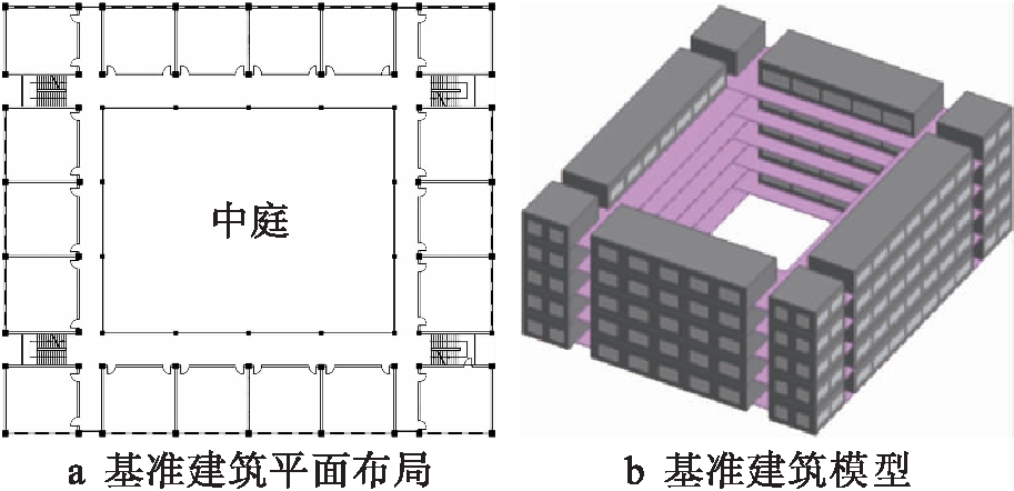 20 mm厚水泥砂浆内外抹灰,哈尔滨地区外墙厚490 mm,传热系数K=1.22 W/(m2·K),北京地区外墙厚370 mm,K=1.50 W/(m2·K);其余城市外墙厚均为240 mm,K=2.01 W/(m2·K);屋面均为120 mm厚钢筋混凝土加20 mm厚水泥砂浆内外抹灰,K=3.96 W/(m2·K);外窗均为3 mm白色单层玻璃普通铝合金窗,K=6.4 W/(m2·K).基准建筑的平面布局和模拟模型如图1所示.