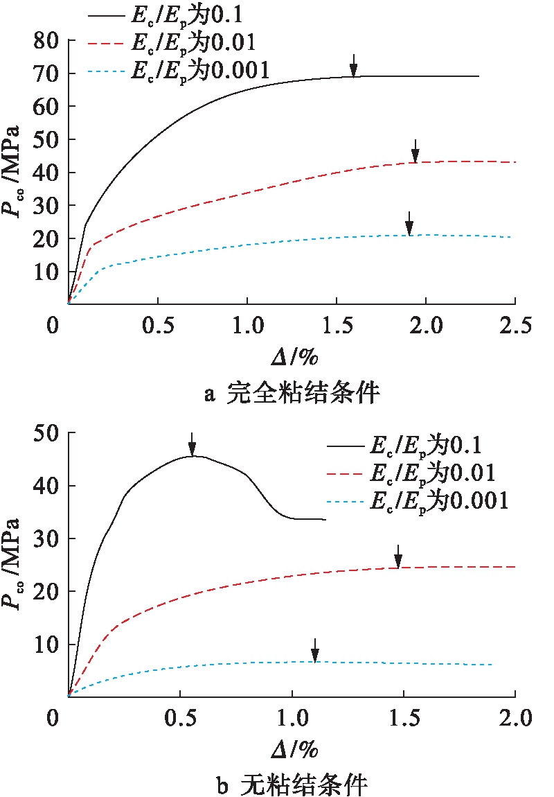 在内管和外管的厚径比t/r均为0.05,夹芯层材料与内外管钢材的弹性模量比值Ec/Ep分别为0.001、0.01和0.1的情况下(初始椭圆率Δ0=0.2%),夹层管分别在层间完全粘结和无粘结状态时的压力