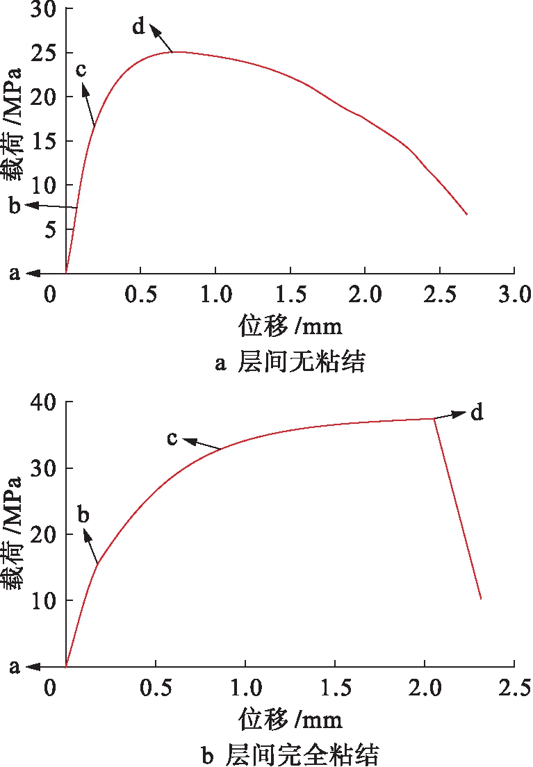 从图3中可以看出,载荷曲线先上升后下降,在图中存在一载荷最大值,在该点时,夹层管结构发生屈曲,载荷值即为临界屈曲外压.从图4、5可以看出,夹层管在达到压溃压力之前有较大的塑性变形过程,并且在屈曲发生时,层间完全粘结情况下的塑形应变高于层间无粘结的情况.对于层间粘结和不粘结两种情况,夹层管结构的塑性应变都首先出现在内层钢管,并且随着外压的增加,塑性应变区逐渐扩展至夹层以及外层钢管,当达到临界屈曲荷载时,各层塑性应变分布如图4d、5d所示,内层钢管及中间水泥基夹层材料均出现塑性变形,在管道对称纵截面处出现较高的塑性应变.两种层间粘结条件下的计算结果及与试验的比较如表2所示.