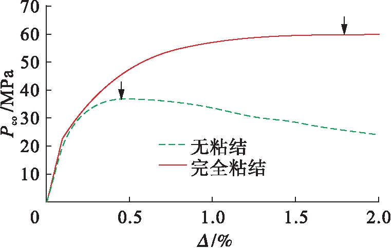 在内外管的厚径比分别为t2/r2=0.05、t1/r1=0.03,初始椭圆率Δ0=0.2%的情况下,得到夹层管在层间完全粘结和层间无粘结两种形态下的压力