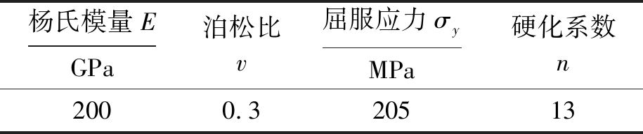 式中:ε为真实应变;σ为真实应力;σy为屈服应力;E为杨氏模量;n为材料硬化系数.材料塑性特性采用各项同性强化J2塑性流动理论计算.