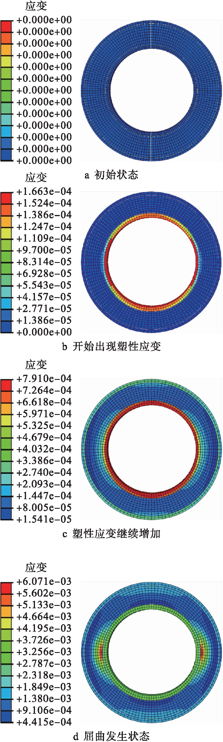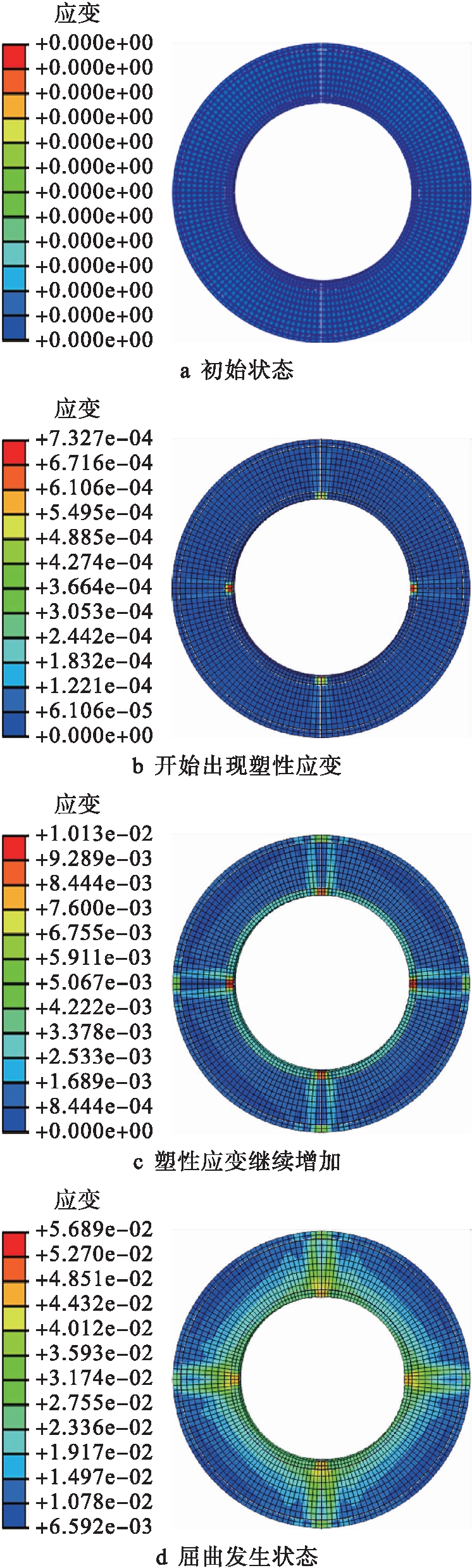 位移曲线,图4、5分别为其相对应夹层管在外压作用下的塑性应变分布过程,其中,图4a、b、c、d四图分别对应图3中a、b、c、d四个状态.