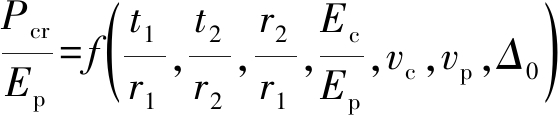分别为外管最大和最小外半径.夹层管的承载力与内外层管的厚径比t1/r1和t2/r2、内外层管的外径比r2/r1及材料常数相关,为比较夹层管在总体截面尺寸不改变的情况下各参数的影响,计算取夹层管的外半径r1=100 mm,夹层管的内半径r=60 mm,则内管的厚径比为