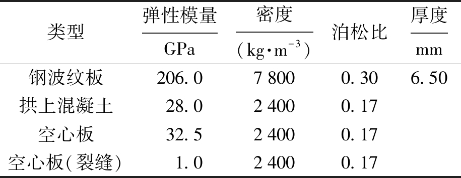 类型弹性模量GPa密度(kg·m-3)泊松比厚度mm钢波纹板206.078000.306.50拱上混凝土28.024000.17空心板32.524000.17空心板(裂缝)1.024000.17