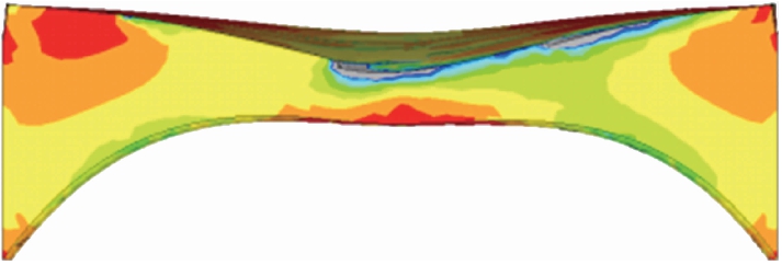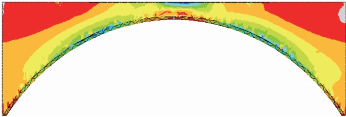 图18、19分别为175和575 mm厚钢波纹板拱上混凝土填料弹性应变图.通过对比可知,随着混凝土填料高度的增加,钢波纹板拱的弹性应变也相应减小.随着拱顶混凝土填料厚度增高,钢波纹板拱与混凝土填料相互作用而产生的弹性应变影响范围逐渐缩小.当混凝土填料高度减小到一定程度后,钢波纹板和混凝土回填料相互作用产生的应变一直扩大到拱顶混凝土的表面.