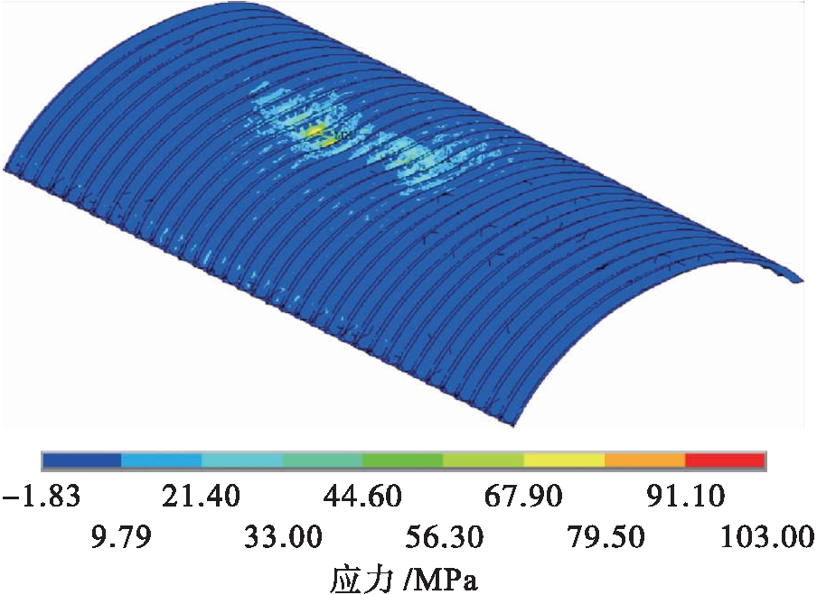 在汽车荷载作用下,加固结构体系产生较大内力,钢波纹板第一主应力最大值达66.9 MPa,为拉应力,位于拱顶.第二主应力和第三主应力的空间分布与恒载作用下相似,但数值增加明显.钢波纹板受力较为均匀,第一主应力位于拱顶靠近跨中区域,取得最大值.拱顶第一主应力明显大于1/4跨和拱脚附近区域,但是拱顶大部分区域受压,在断板区域受力明显为拉应力.而拱顶区域的第三主应力小于1/4跨和拱脚附近区域,拱脚处第三主应力最大值为68.4 MPa.