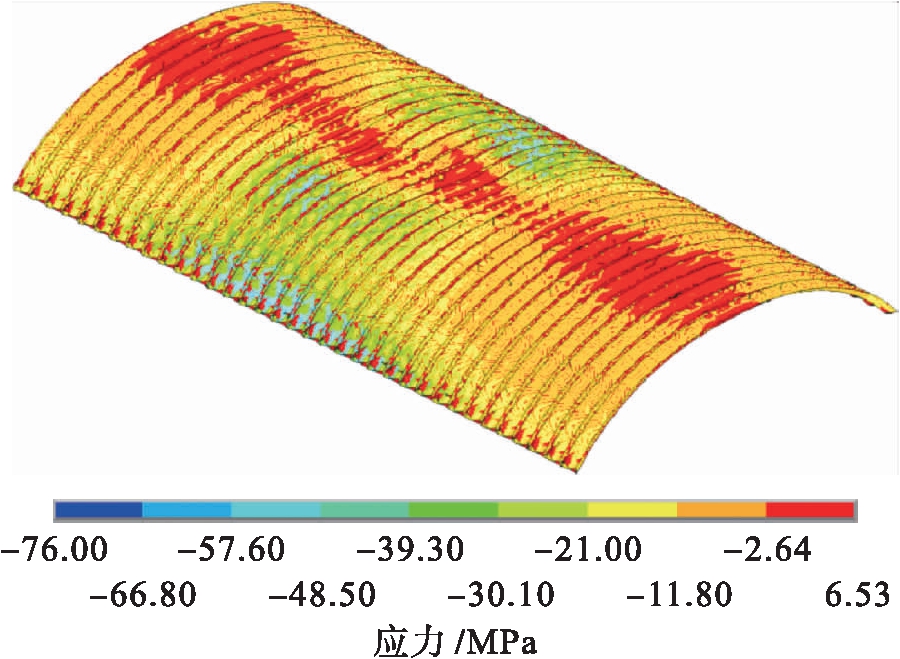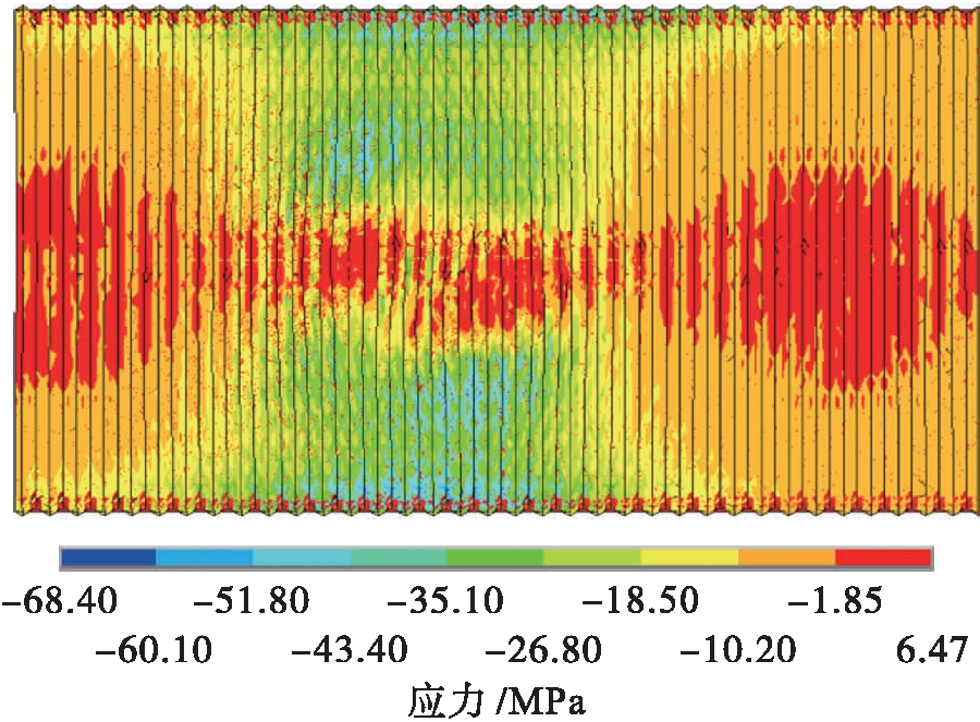 挂-120荷载作用下,结构体系中钢波纹板第一主应力、第二主应力和第三主应力如图13~15所示.可以看出,在挂车荷载作用下,加固结构体系产生较大内力,主要集中在加载车道下方,第一主应力最大值达到67.9 MPa,为拉应力,与汽超-20荷载内力值较接近.第二主应力和第三主应力的空间分布与汽超-20荷载作用下相似.拱顶区域的第三主应力小于1/4跨和拱脚附近区域,拱脚处第三主应力最大值为76 MPa,稍大于汽超-20荷载的第三主应力值.1/4跨和拱脚附近区域第三主应力主要处于21.0~57.6 MPa之间,稍小于汽超-20荷载的拱脚区域的第三主应力,这表明汽车荷载作用时,钢波纹板拱受力更加均匀,而挂车荷载作用下,结构体系存在一定的应力集中.
