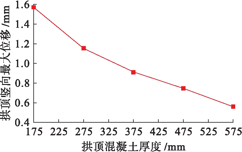 在其他条件不变的情况下,钢波纹板拱上混凝土填料逐级增加,填料厚度与钢波纹板拱顶竖向最大位移关系如图16所示.回填混凝土的竖向最大位移与钢波纹板拱竖向最大位移随着拱顶混凝土高度的增加而减小,且两者大致呈线性关系.