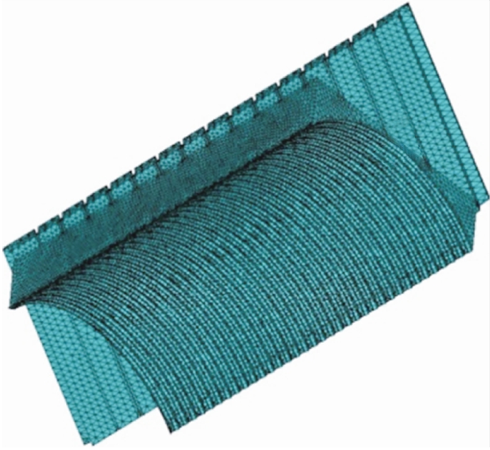 选取Shell63四节点壳单元建立钢波纹板拱.拱上混凝土选取Solid95二十节点实体结构单元建立.空心板梁同样选取Solid95单元.钢波纹板和拱上新浇筑的混凝土之间采用接触单元Con-tal74和Targel70模拟[12].