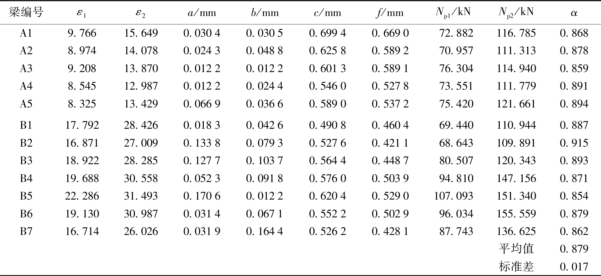 梁编号ε1ε2a/mmb/mmc/mmf/mmNp1/kNNp2/kNαA19.76615.6490.03040.03050.69940.669072.882116.7850.868A28.97414.0780.02430.04880.62580.589270.957111.3130.878A39.20813.8700.01220.01220.60130.589176.304114.9400.859A48.54512.9870.01220.02440.54600.527873.551 111.7790.891A58.32513.4290.06690.03660.58900.537275.420121.6610.894B117.79228.4260.01830.04260.49080.460469.440110.9440.887B216.87127.0090.13380.07930.52760.421168.643109.8910.915B318.92228.2850.12770.10370.56440.448780.507120.3430.893B419.68830.5580.05230.09180.57600.503994.810147.1560.871B522.28631.4930.17060.01220.62040.5290107.093151.3400.854B619.13030.9870.03140.06710.55220.502996.034155.5590.879B716.71426.0260.03190.16440.52620.428187.743136.6250.862平均值0.879标准差0.017