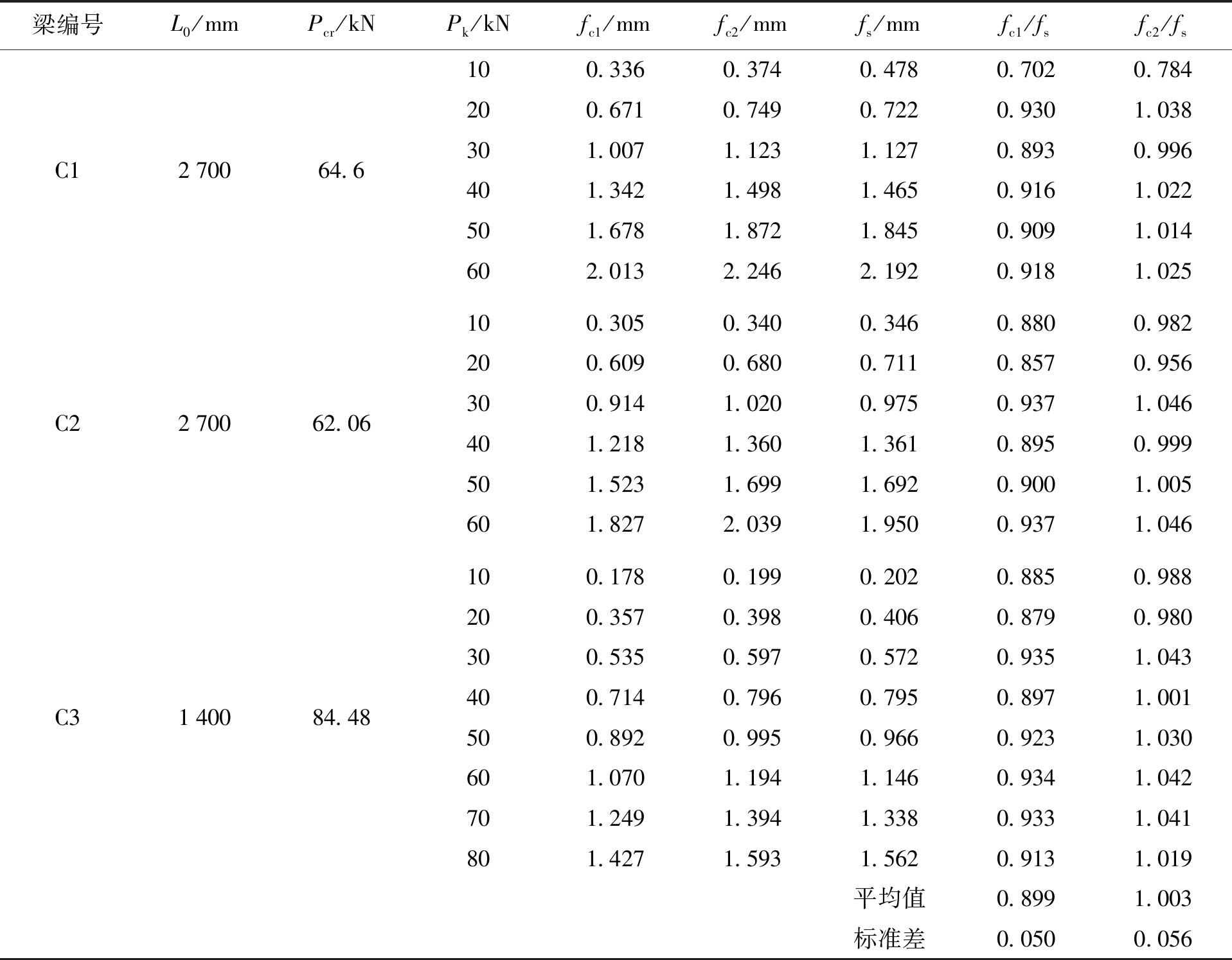 梁编号L0/mmPcr/kNPk/kNfc1/mmfc2/mmfs/mmfc1/fsfc2/fsC1270064.6C2270062.06C3140084.48100.3360.3740.4780.7020.784200.6710.7490.7220.9301.038301.0071.1231.1270.8930.996401.3421.4981.4650.9161.022501.6781.8721.8450.9091.014602.0132.2462.1920.9181.025100.3050.3400.3460.8800.982200.6090.6800.7110.8570.956300.9141.0200.9750.9371.046401.2181.3601.3610.8950.999501.5231.6991.6920.9001.005601.8272.0391.9500.9371.046100.1780.1990.2020.8850.988200.3570.3980.4060.8790.980300.5350.5970.5720.9351.043400.7140.7960.7950.8971.001500.8920.9950.9660.9231.030601.0701.1941.1460.9341.042701.2491.3941.3380.9331.041801.4271.5931.5620.9131.019平均值0.8991.003标准差0.0500.056