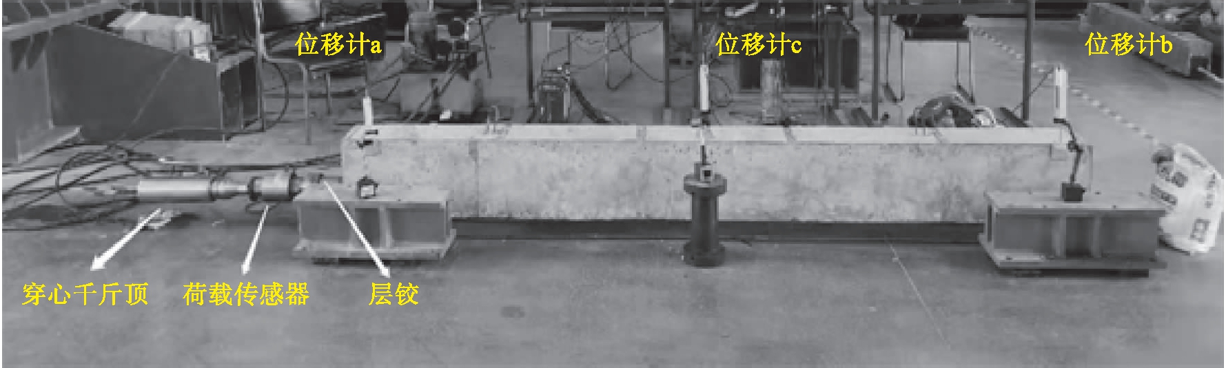 由于试验梁较短,为了减小预应力损失,采用低回缩锚具及辅助张拉装置结合二次张拉工艺方法[7]进行张拉.在正式加载前,先进行两次预加载,以消除支座及加载装置间隙对变形的影响.第一次张拉时,每级荷载为张拉控制应力的10%(即10%σcon),共十级,每级荷载持载3 min,然后缓慢放张,第二次张拉将辅助张拉装置,即中空、立面局部开口的圆柱型层铰放置在穿心千斤顶前段,然后将预应力筋一次性张拉至σcon,同时拧紧低回缩锚具的锚环以弥补张拉端锚具变形和钢筋的回缩量.两次张拉的荷载、混凝土应变以及试验梁的变形值均通过IMC动态数据采集仪自动采集.
