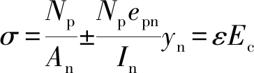 式中:σ为由预加力产生的混凝土法向应力;Np为预应力自密实再生混凝土梁的有效预加力;An为试验梁净截面面积;epn为净截面重心至预应力钢筋和普通钢筋合力点的距离;yn为净截面重心至所计算纤维处的距离;ε为计算纤维处混凝土的应变值;Ec为混凝土的弹性模量.