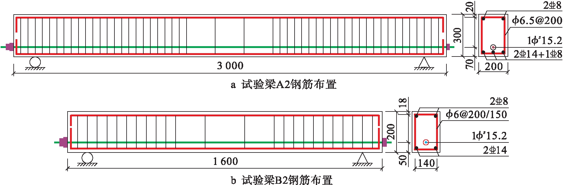 试验对2组共12根有粘结后张法现浇预应力自密实再生混凝土简支梁进行张拉阶段的受力监测,试验梁混凝土强度均为C40,其中,A组试验梁5根,尺寸均为200 mm×300 mm×3 000 mm,立方体抗压强度为48.57 MPa,混凝土弹性模量为3.25×104 N/mm2;B组试验梁7根,尺寸均为140 mm×200 mm×1 600 mm,立方体抗压强度为47.02 MPa,混凝土弹性模量为4.01×104 N/mm2.普通纵向受力钢筋采用HRB400级钢筋,箍筋为HPB300级钢筋,弹性模量为2.1×105 N/mm2,预应力筋采用低松弛1860级钢绞线,公称直径为15.2 mm,弹性模量为1.95×105 N/mm2,张拉控制应力均为0.75fptk,预应力筋采用直线布筋形式.部分试验梁的钢筋布置如图2所示(单位:mm),试验参数如表1所示.