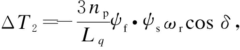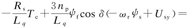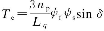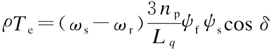 式中:Usx、Usy为定子电压x、y分量;Isx、Isy为定子电流x、y分量;ψs为定子磁链幅值;ψf为转子永磁体磁链幅值;ωs为定子磁链的电角速度;Rs为定子电阻;Ld、Lq为定子电感的d、q分量;ψsd、ψsq为定子磁链幅值的d、q分量;Id、Iq为定子电流的d、q分量;np为电机的极对数;Te为电磁转矩;ρ为微分算子.