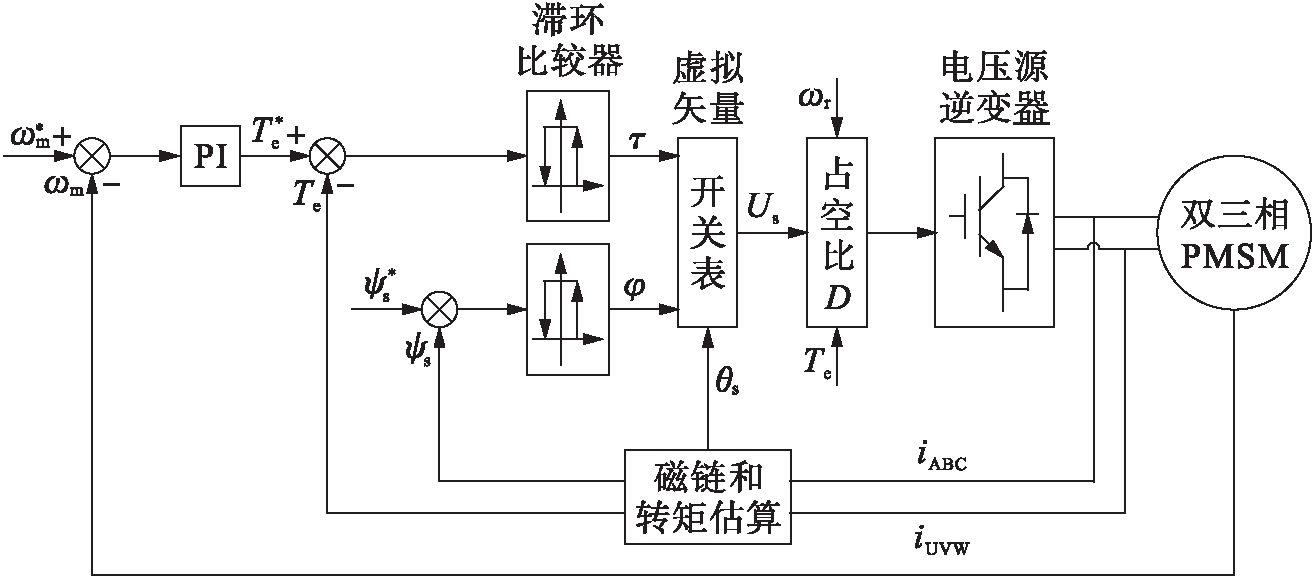 磁场定向控制(field oriented control,FOC)是电机驱动最常用的方法[4],定子相电流谐波含量小,然而旋转变换比较复杂,很难得到理论分析的结果.模型预测控制(model predictive control,MPC)作为一种新的控制策略被应用于多相电机[5],能够获得较好的动态性能,但存在对电机参数敏感、计算量大等缺点.直接转矩控制(direct torque control,DTC)结构简单、转矩动态响应快,被广泛应用于三相电机,但低速转矩脉动大[6].电机相数的增加有利于将直接转矩控制推广到多相电机系统.文献[7]将空间矢量调制(space vector modulation,SVM)应用到直接转矩控制中,但计算复杂,失去了传统DTC控制简单的优点.文献[8]在分析转矩增减不对称的基础上,设计了一种滞环宽度可调的转矩控制器,可以有效减小转矩稳态误差,但需要在线计算以及额外增加一个PI调节器.文献[9]通过构造中间矢量可以很好地抑制谐波电流.占空比DTC能有效降低转矩和磁链脉动,与SVM-DTC相比,计算量和复杂性都减小很多[10].