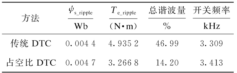 从表4中可以看出,在两种算法开关频率相近的情况下,相比于传统DTC,占空比DTC的转矩脉动减小了33.81%,相电流的总谐波量减小了69.78%.