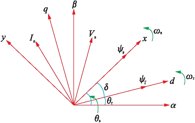 双三相永磁同步电机的相量图如图1所示.α-β为静止坐标系,d-q为转子坐标系,x-y为定子坐标系,其中永磁体磁链ψf和d轴同向,定子磁链ψs和x轴同向.