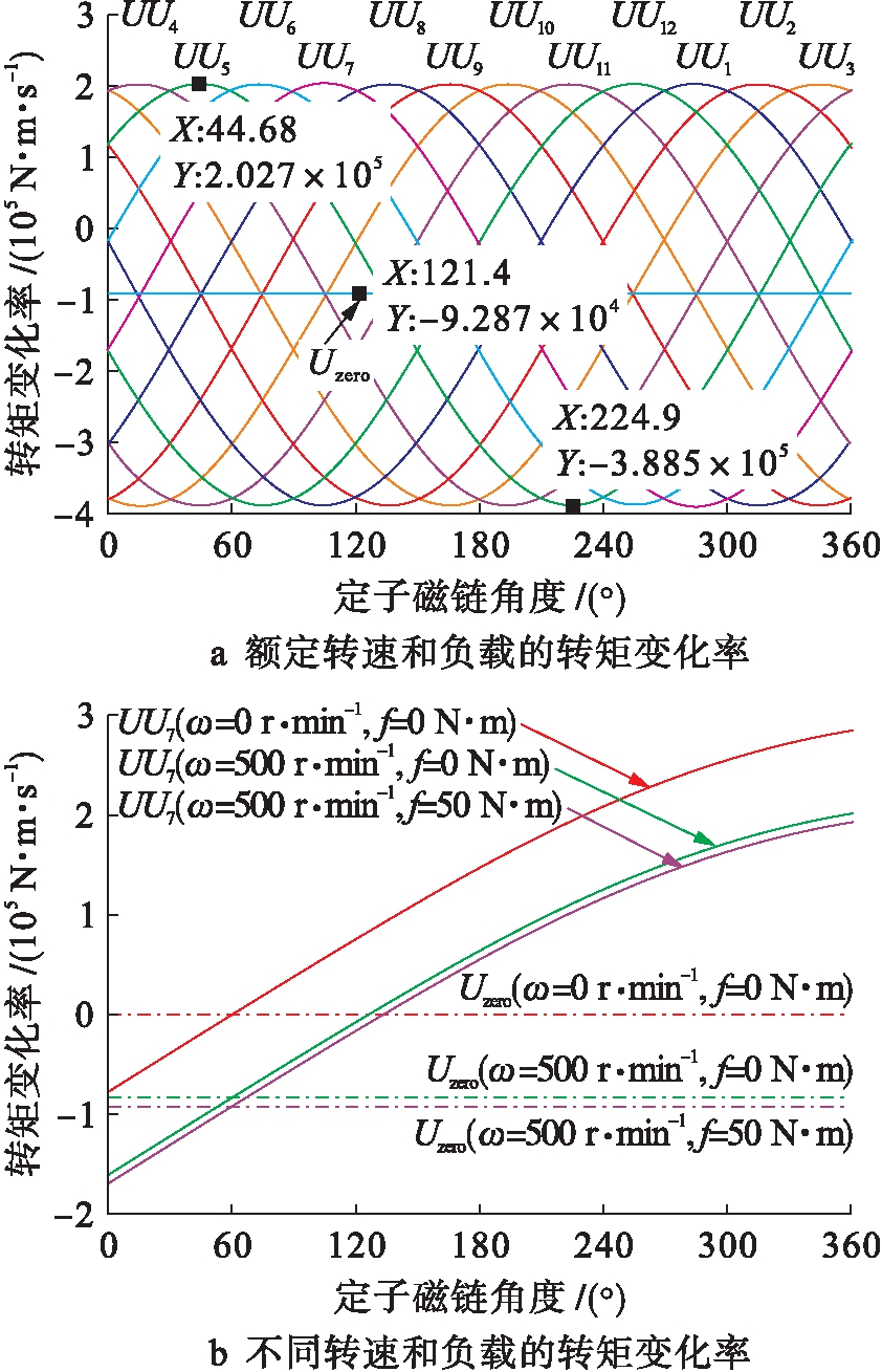 图3a为本文所用电机在额定转速和额定负载运行时,在不同虚拟矢量和零矢量作用下的转矩变化率.可以看出,零矢量作用下转矩的变化率为-9.287×104 N·m/s,总是使转矩减小.合成虚拟矢量对转矩的作用与磁链的位置有关,最小转矩变化率为-3.885×105 N·m/s,最大转矩变化率为2.027×105 N·m/s,转矩减小的速率比转矩增加的速率要大.电压矢量引起转矩增加的变化率和减小的变化率存在明显的不对称,这是产生转矩脉动的一个主要原因.图3b为定子磁链位于第一扇区,电机在不同转速和负载运行时,合成矢量UU7和零矢量对转矩变化率的影响.可以看出,电机转速对转矩变化率的影响要比负载大得多.