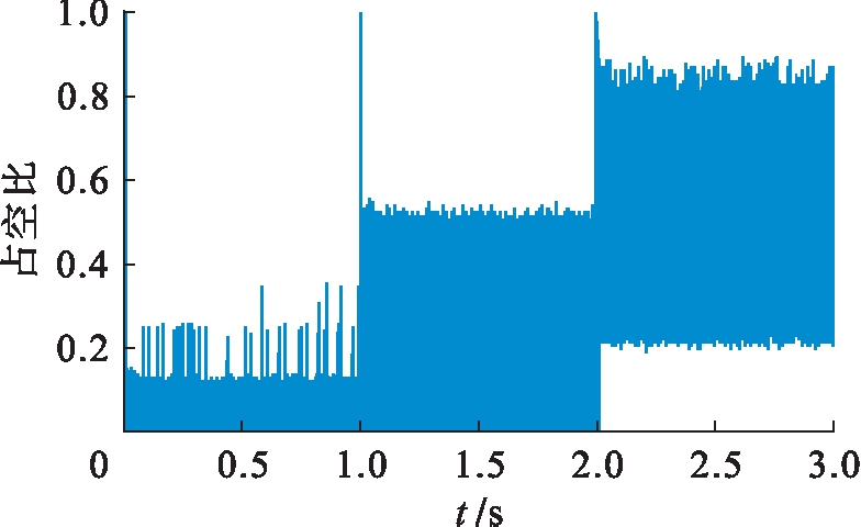 图9给出了电机在不同转速下占空比的仿真结果,条件为:0~1 s为50 r/min,1~2 s为250 r/min,2~3 s为450 r/min,负载转矩一直为空载.从图9中可以看出,在电机启动阶段和转速突然变化时,占空比的值为1,表明有效矢量作用整个控制周期,从而使转矩能迅速达到给定值.稳定后,占空比的大小与电机转速密切相关,0~1 s低速运行时,占空比的平均值约为0.1,这也说明了传统直接转矩控制中低速性能差的原因;2~3 s高速运行时,占空比的平均值约为0.6.结果表明,电机转速对占空比有很大影响.